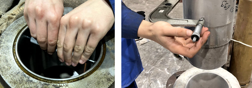 A chaque étape, prise de cotes très précise car le métal bouge de quelques centièmes. Juste ce qu’il faut pour réaliser un montage au cordeau ! Ensuite, nous avons donc réalisé le montage de l’arbre dans le galet, sans autre boulonnage ou autre système d’accroche entre les 2 éléments.